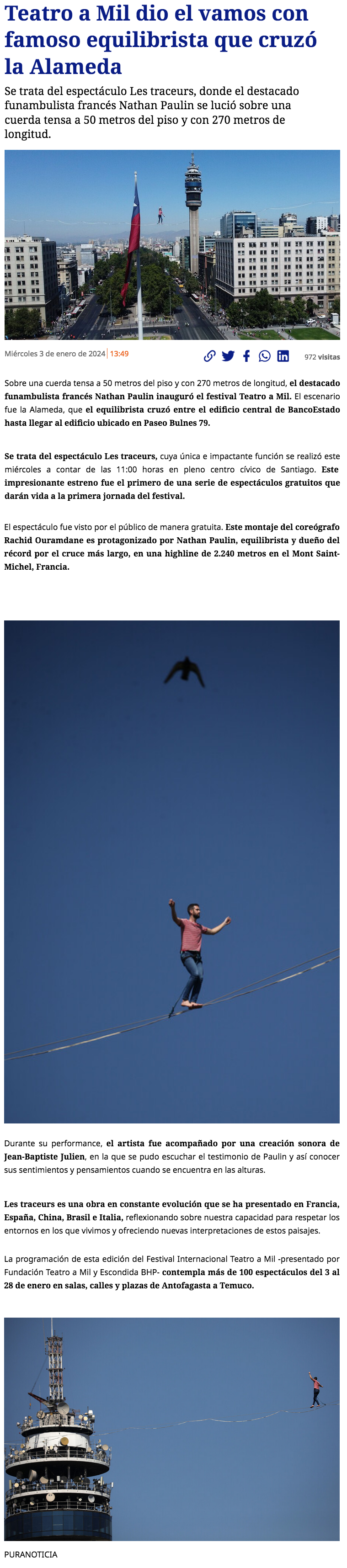 Teatro a Mil 2024 da el vamos con famoso equilibrista que cruzará la Alameda desde las alturas - (El Mostrador)