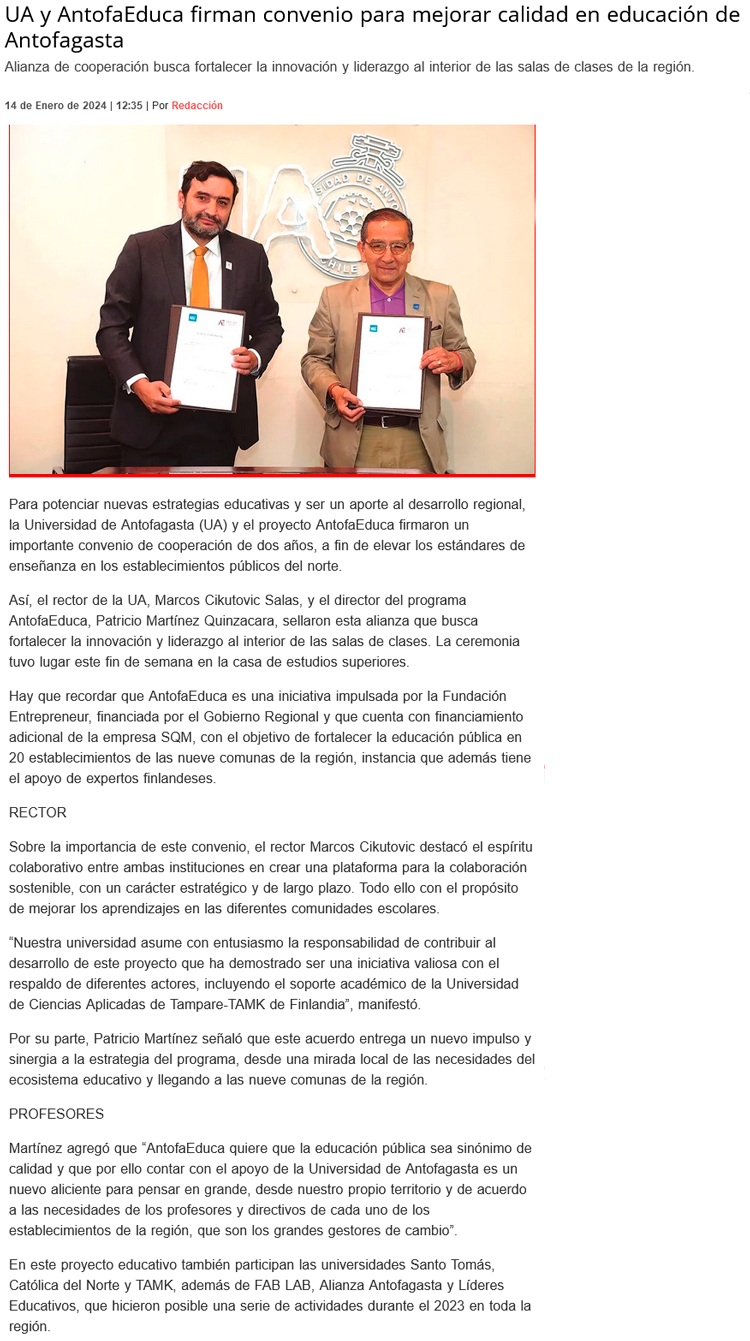UA y AntofaEduca firman convenio para mejorar calidad en educación - (El Mercurio de Antofagasta)