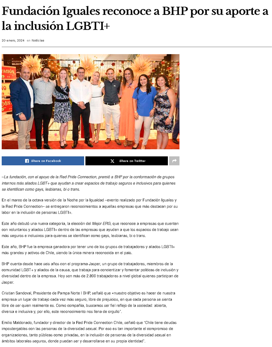 Fundación Iguales reconoce a BHP por su aporte a la inclusión LGBTI+ - (mch.cl)