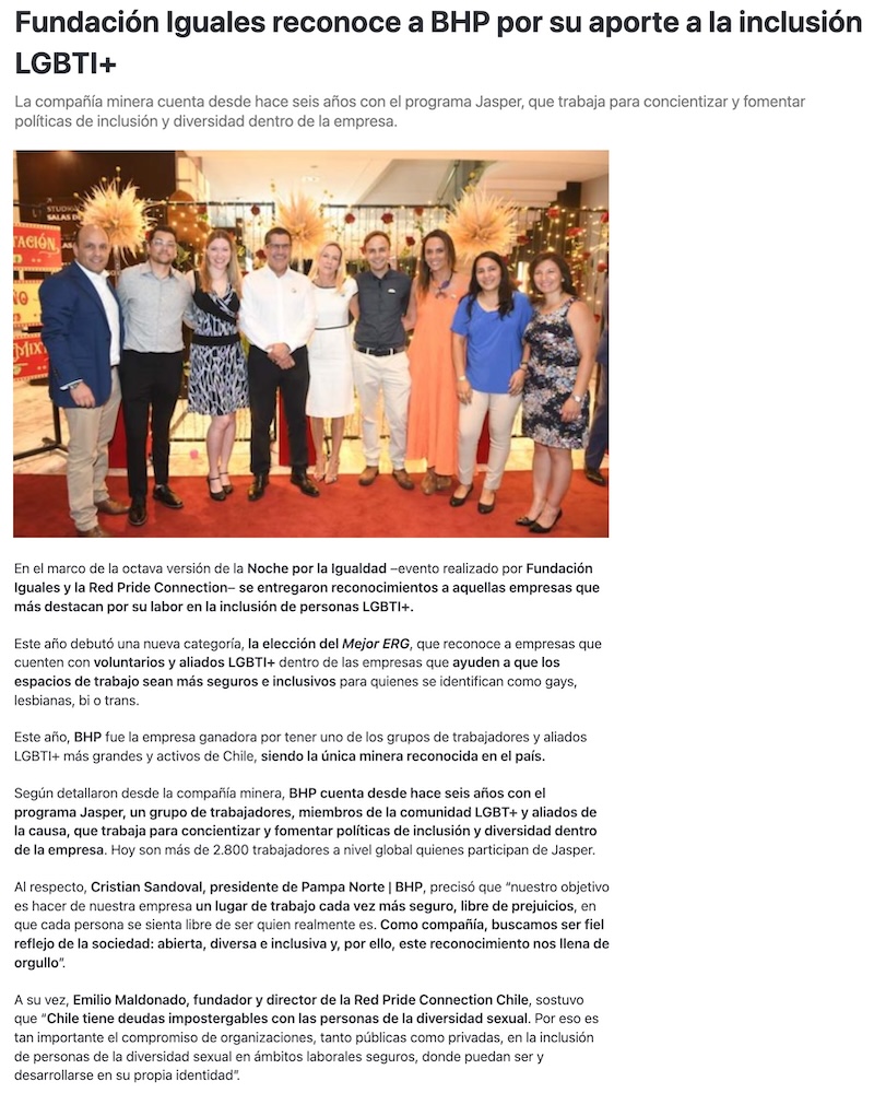 Fundación Iguales reconoce a BHP por su aporte a la inclusión LGBTI+ - (mch.cl)