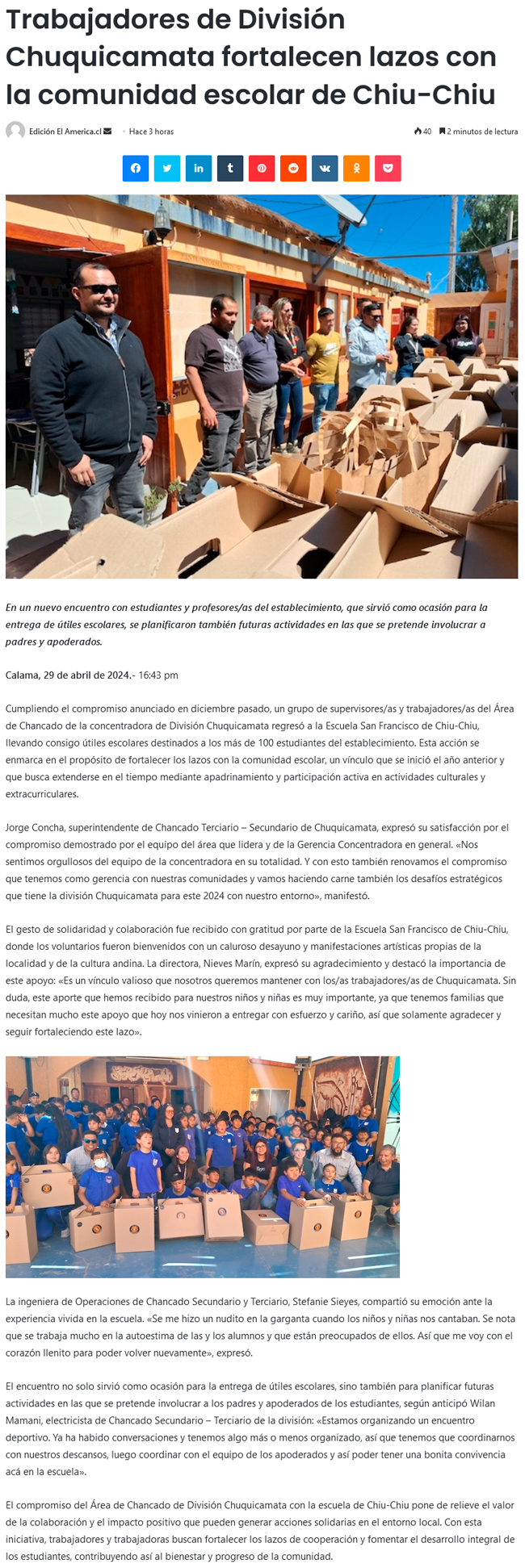 Entrega útiles escolares a alumnos de la escuela de Chiu Chiu - (El Mercurio de Calama)