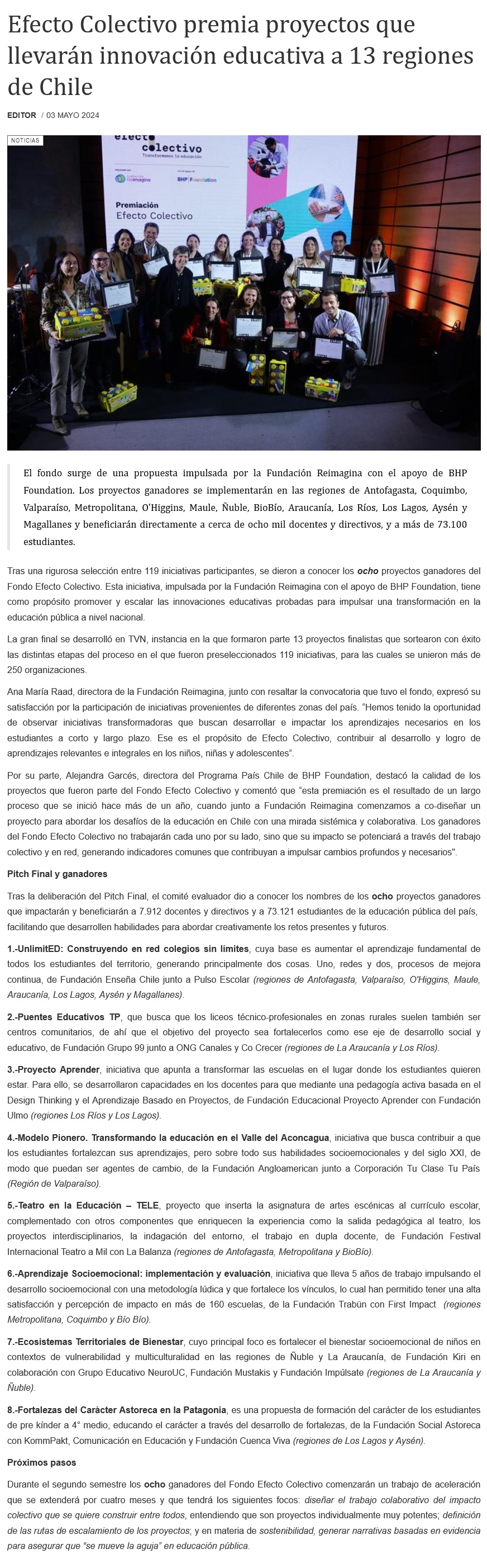 Enfocados en la educación pública: Efecto Colectivo premia proyectos que llevarán innovación educativa a 13 regiones de Chile - (elnortero)