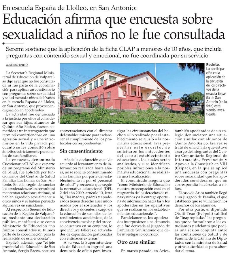 Denuncian que niños de 10 años fueron sometidos a test con preguntas sobre sexualidad - (El Mercurio de Santiago)