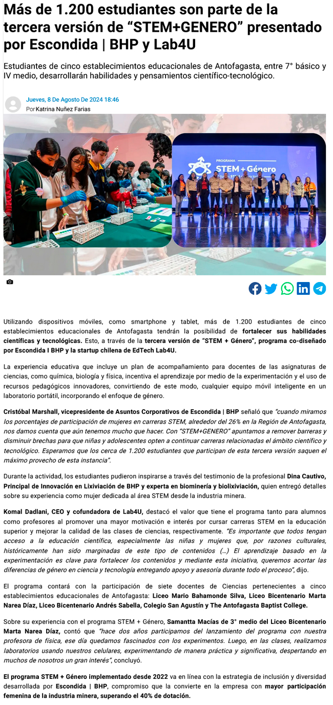 Más de 1.200 estudiantes son parte de la tercera versión de “STEM+GENERO” presentado por Escondida | BHP y Lab4U - (diarioangamos)