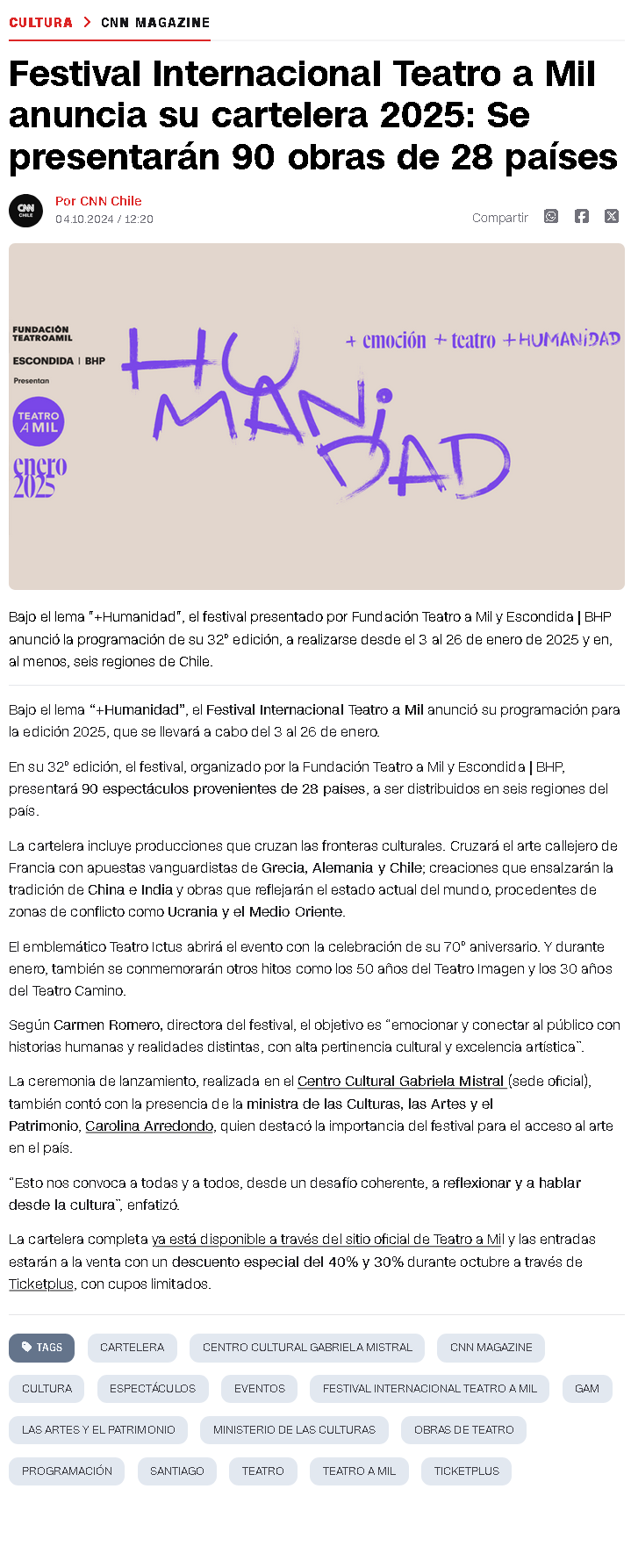 Homenaje a los 70 años de Teatro Ictus y una programación con 90 obras de 28 países marcan el anuncio del Festival Internacional Teatro a Mil 2025 - (g5noticias.cl)