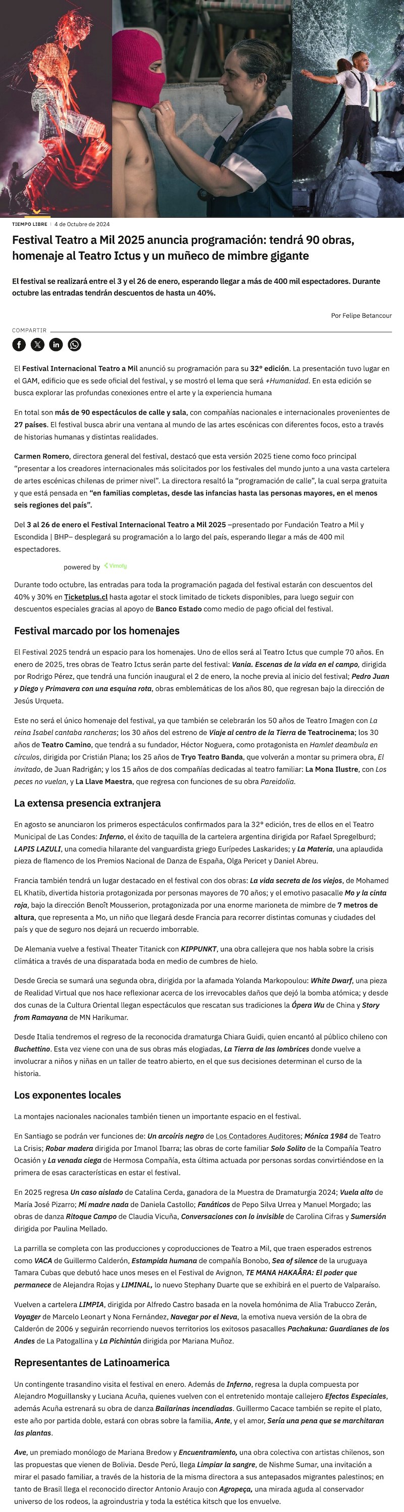 Festival Internacional Teatro a Mil anuncia su cartelera 2025: Se presentarán 90 obras de 28 países - (cnnchile.com)