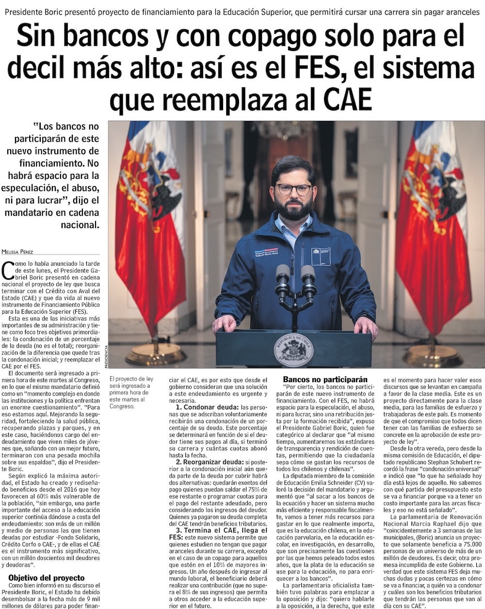 Gobierno anuncia condonación y reprogramación de deudas CAE y nuevo crédito estatal - (El Mercurio de Santiago)