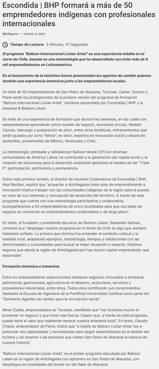 Escondida | BHP impulsa la formación de más de 50 emprendedores indígenas en el norte de Chile - (mineriayfuturo.cl)