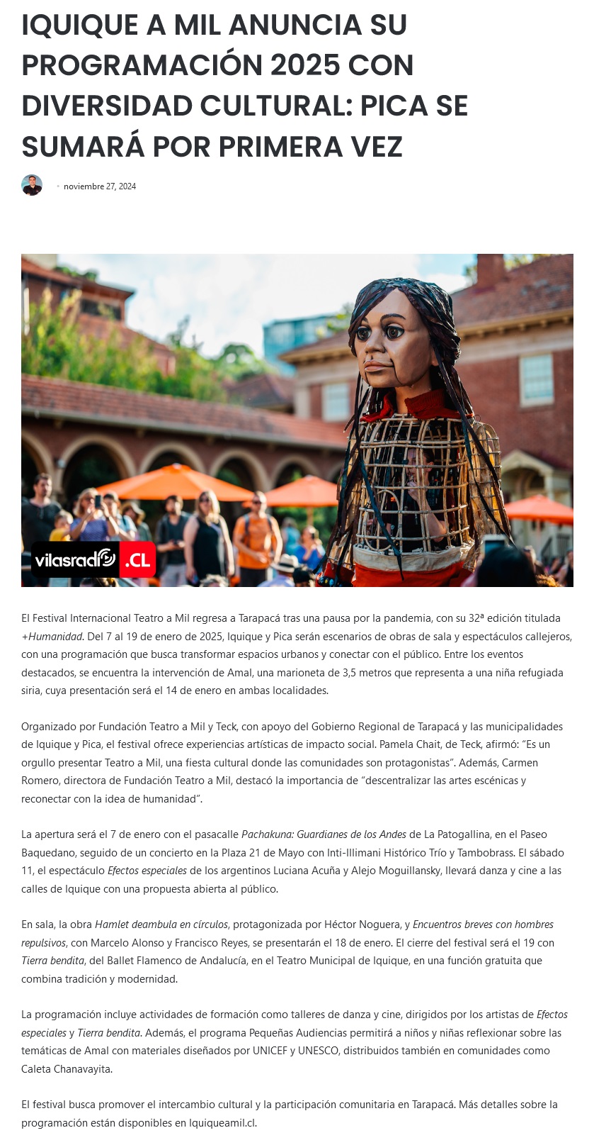 El Festival Teatro a Mil trae la magia escénica a Iquique y Pica - (Estrella de Iquique)