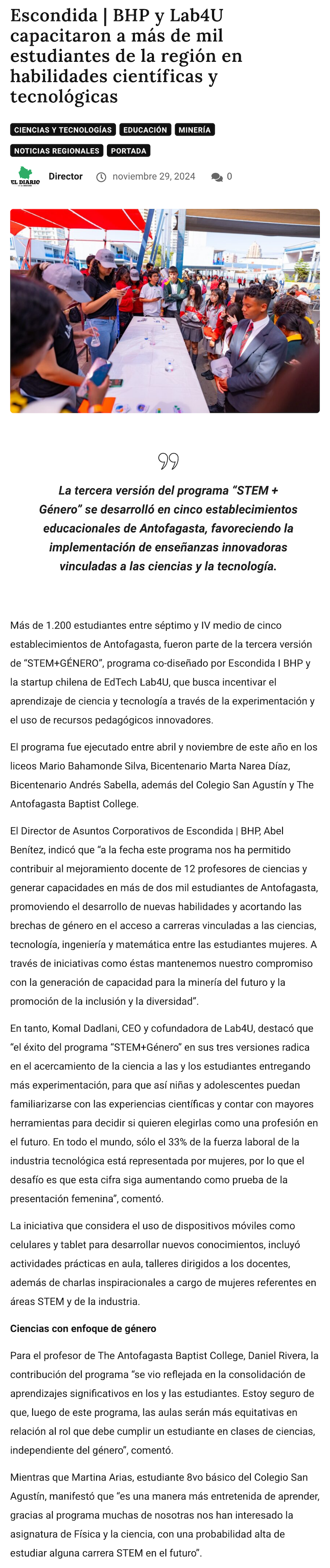Escondida | BHP y Lab4U capacitaron a más de mil estudiantes de la región de Antofagasta en habilidades científicas y tecnológicas - (madero.cl)