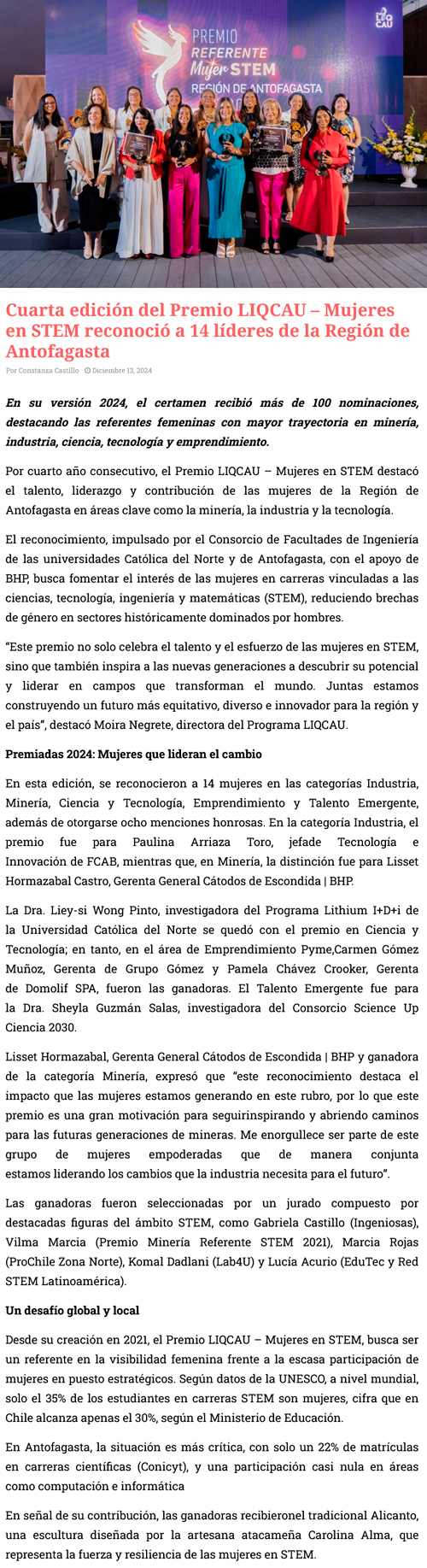Cuarta edición del Premio LIQCAU – Mujeres en STEM reconoció a 14 líderes de la región de Antofagasta - (noticias.ucn.cl)