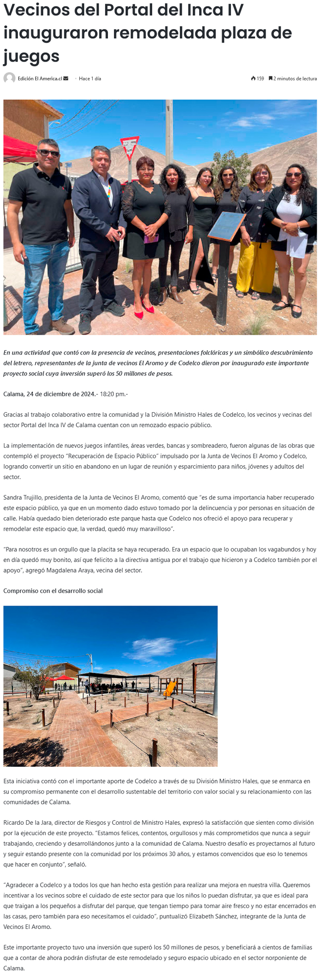 Vecinos del Portal del Inca IV de Calama inauguraron remodelada plaza de juegos - (El Mercurio de Calama)
