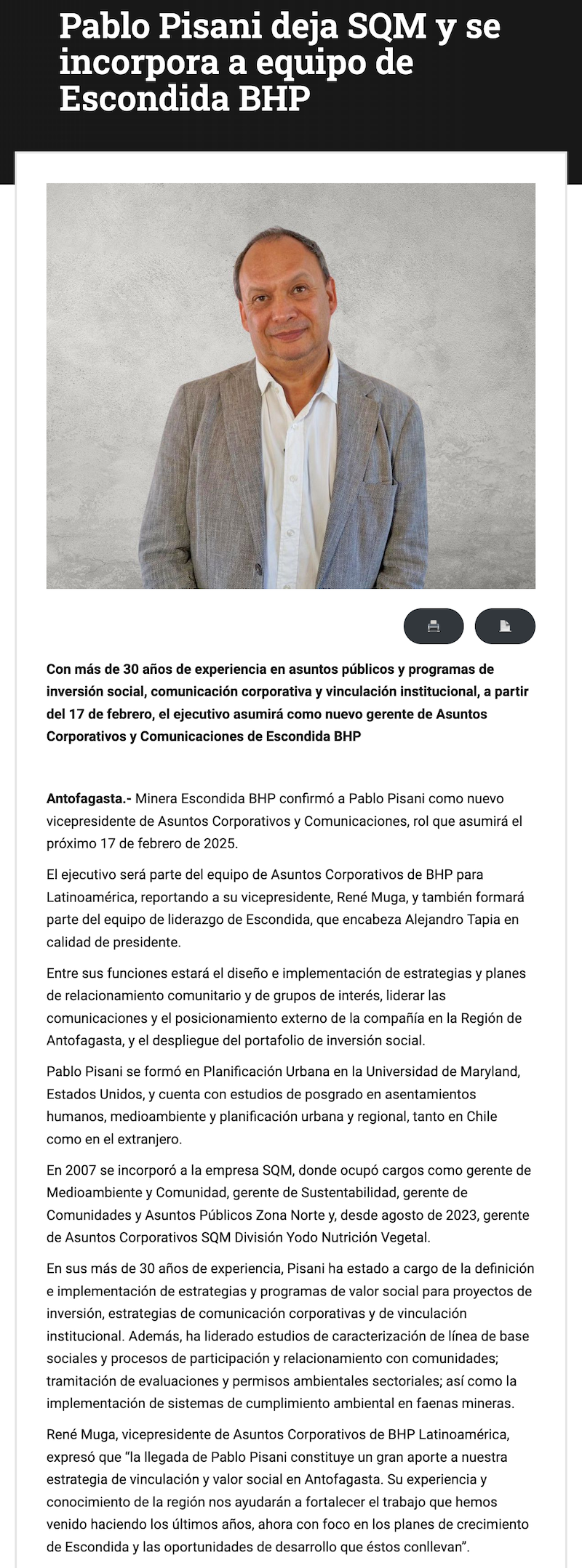 Escondida | BHP confirma a Pablo Pisani como nuevo vicepresidente de Asuntos Corporativos y Comunicaciones - (timeline)