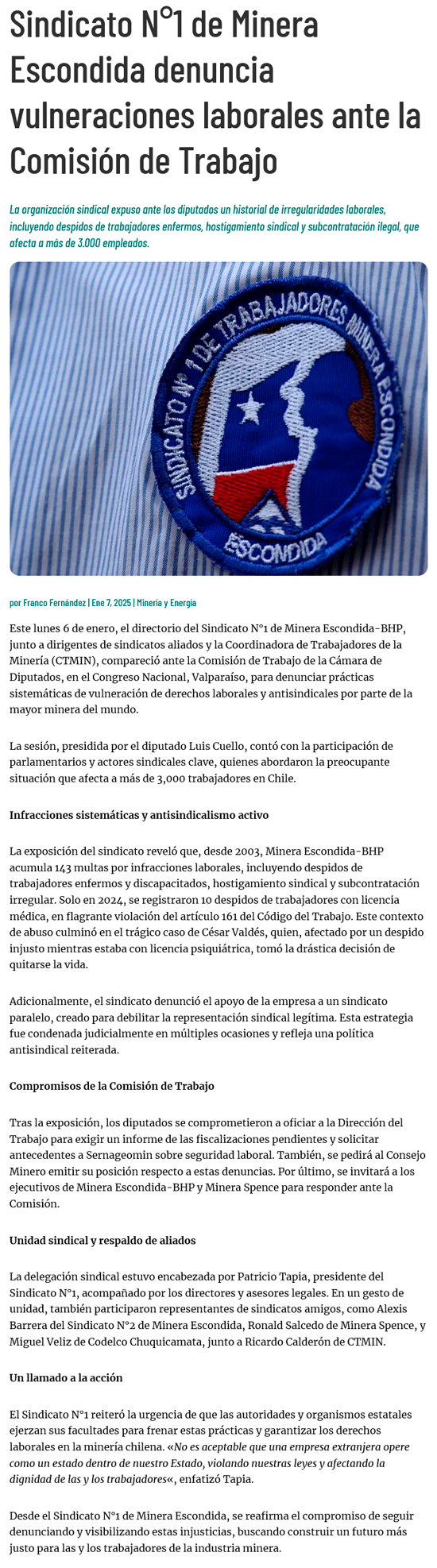 Sindicato N°1 de la Minera Escondida acude a la Cámara de Diputados para denunciar prácticas antisindicales - (g5noticias.cl)