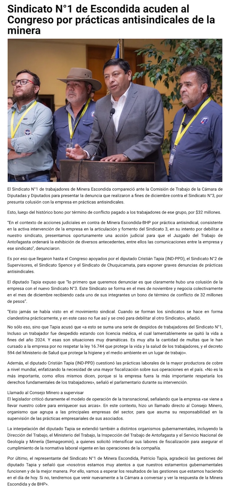 Sindicato N°1 de la Minera Escondida acude a la Cámara de Diputados para denunciar prácticas antisindicales - (g5noticias.cl)