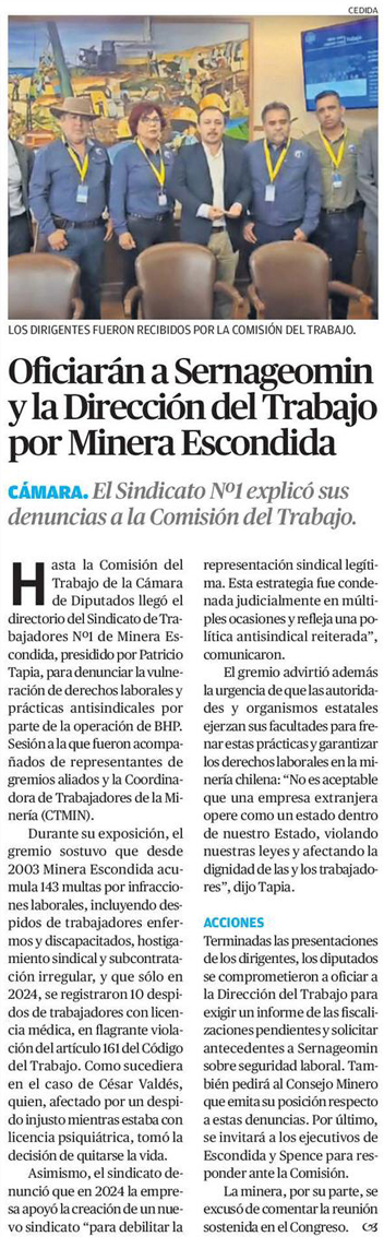 Sindicato N°1 de la Minera Escondida acude a la Cámara de Diputados para denunciar prácticas antisindicales - (g5noticias.cl)