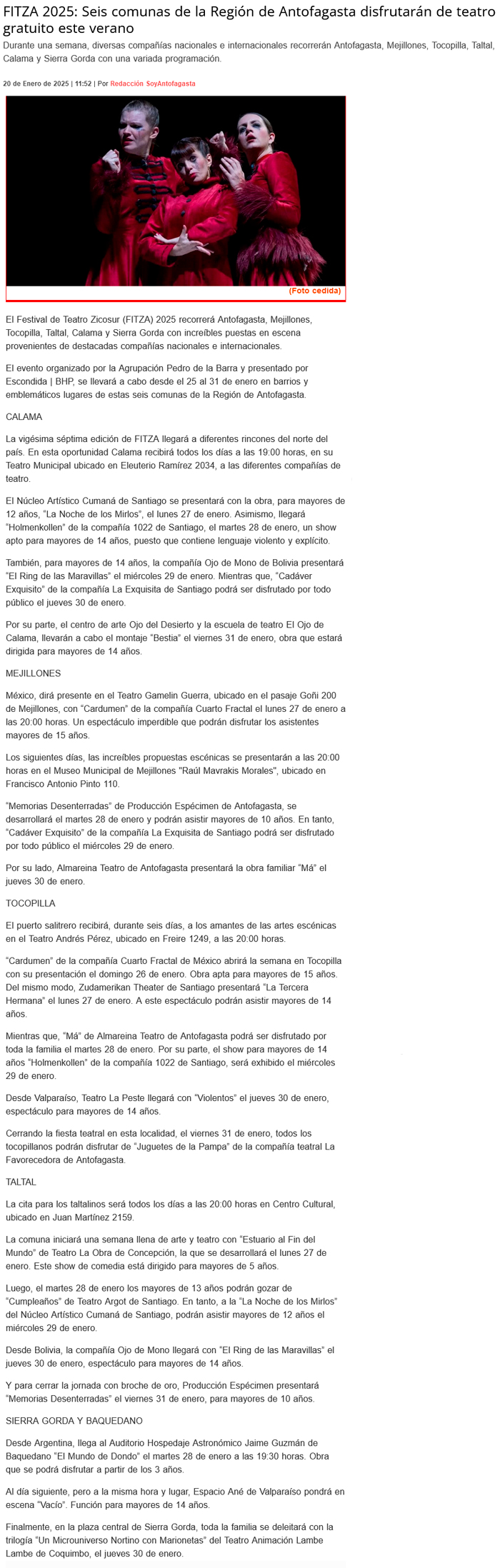 Seis comunas de la Región de Antofagasta se llenarán de arte y teatro gratuito para disfrutar el verano con FITZA 2025 - (cpcomunicaciones.cl)
