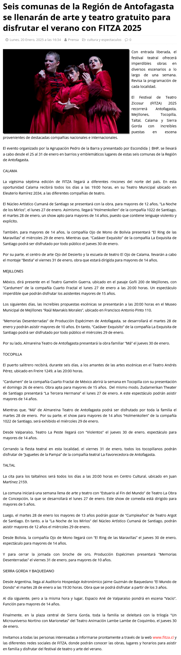 Seis comunas de la Región de Antofagasta se llenarán de arte y teatro gratuito para disfrutar el verano con FITZA 2025 - (cpcomunicaciones.cl)