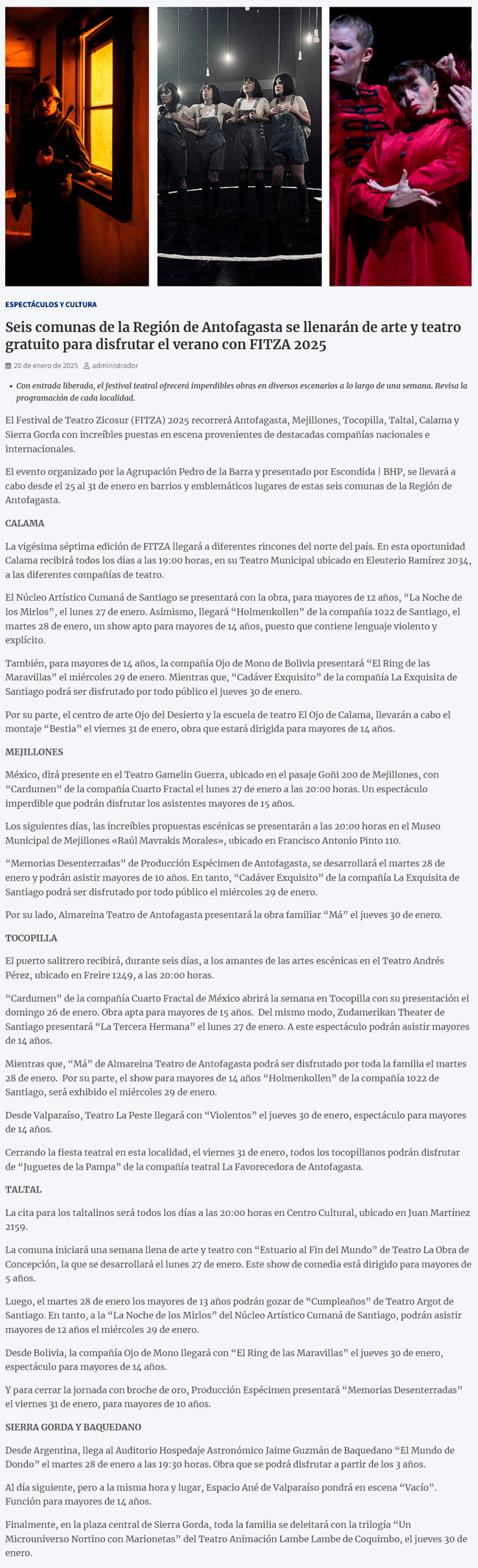 Seis comunas de la Región de Antofagasta se llenarán de arte y teatro gratuito para disfrutar el verano con FITZA 2025 - (cpcomunicaciones.cl)