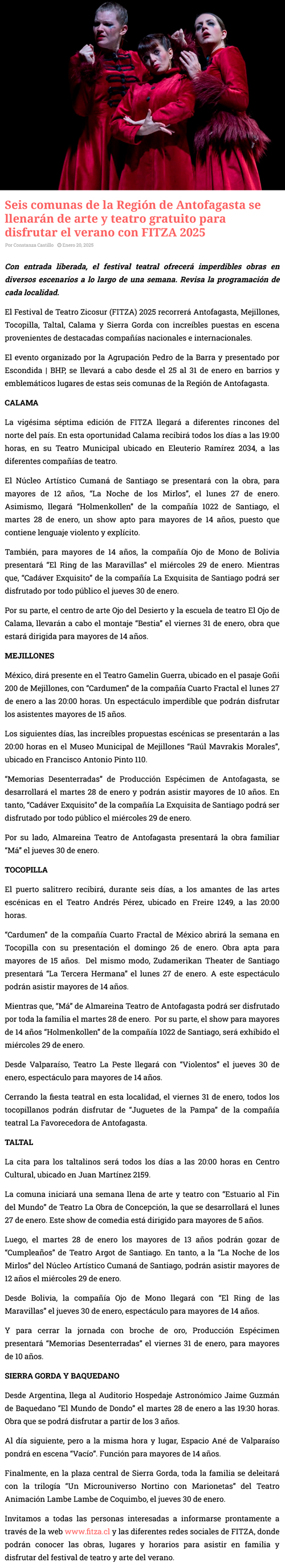 Seis comunas de la Región de Antofagasta se llenarán de arte y teatro gratuito para disfrutar el verano con FITZA 2025 - (cpcomunicaciones.cl)