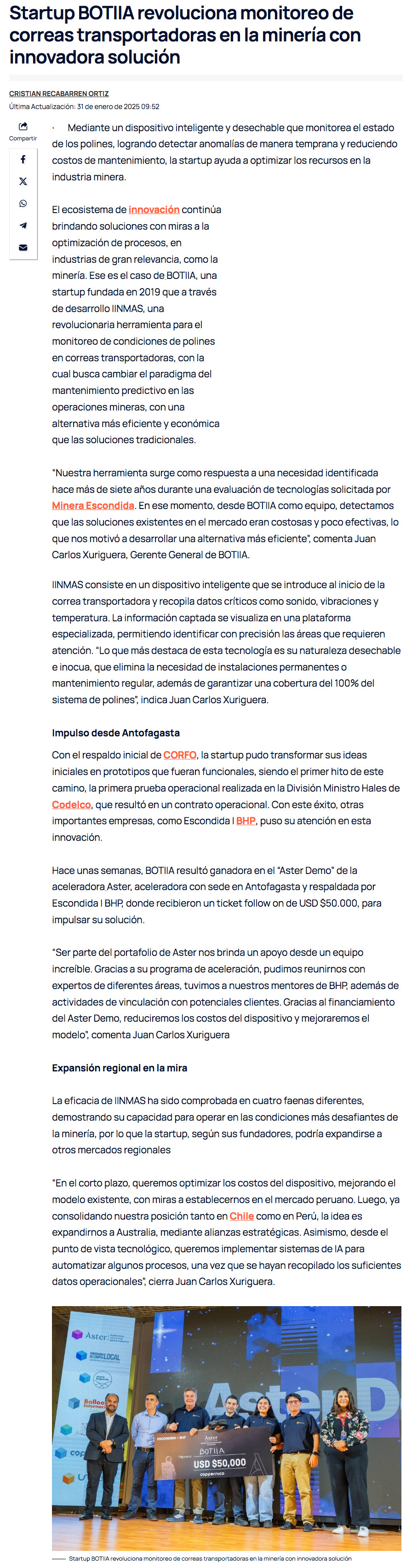 Startup BOTIIA revoluciona monitoreo de correas transportadoras en la minería con innovadora solución - (redmipaisnorte.cl)