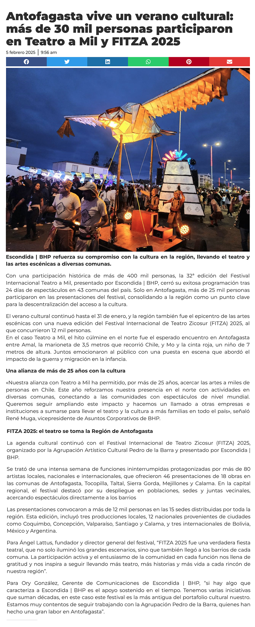 Antofagasta vive un verano cultural: más de 30 mil personas participaron en Teatro a Mil y FITZA 2025 - (redimin)
