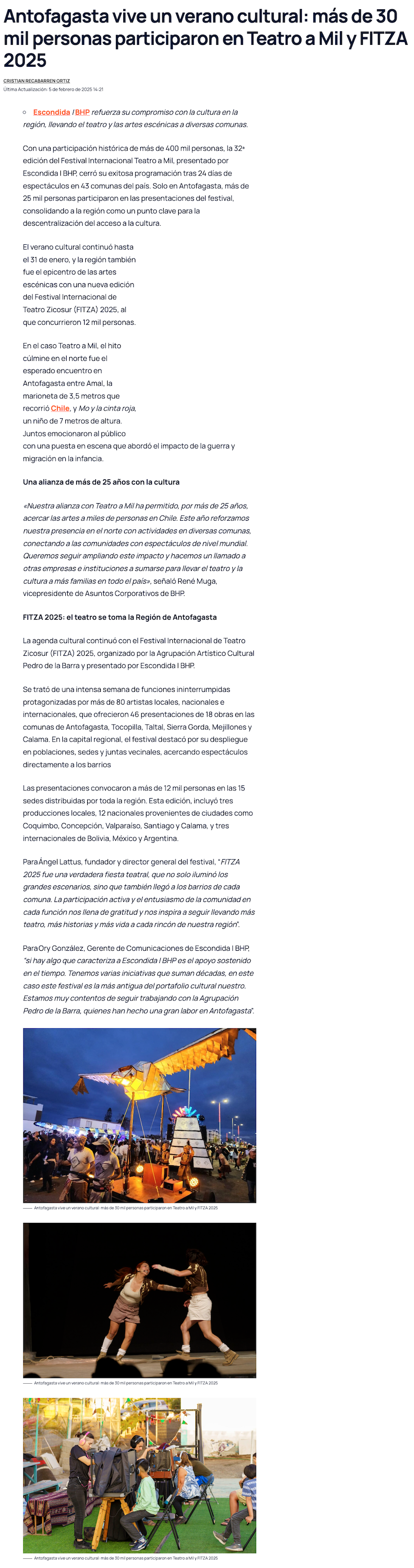 Antofagasta vive un verano cultural: más de 30 mil personas participaron en Teatro a Mil y FITZA 2025 - (portalminero)