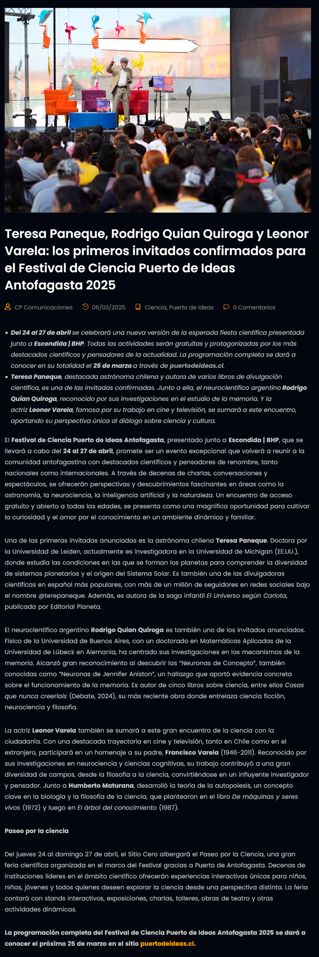 Teresa Paneque, Rodrigo Quian Quiroga y Leonor Varela: los primeros invitados confirmados para el Festival de Ciencia Puerto de Ideas Antofagasta 2025tico - (g5noticias.cl)