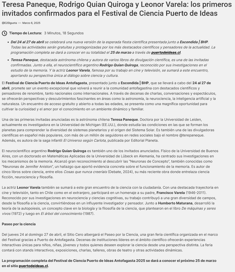 Teresa Paneque, Rodrigo Quian Quiroga y Leonor Varela: los primeros invitados confirmados para el Festival de Ciencia Puerto de Ideas Antofagasta 2025 - (cpcomunicaciones.cl)
