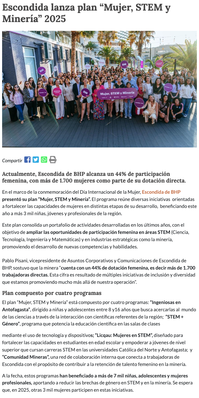 Escondida | BHP lanzó plan “Mujer, STEM y Minería” 2025: abarcaría a más de 3 mil jóvenes de la región - (portalminero)