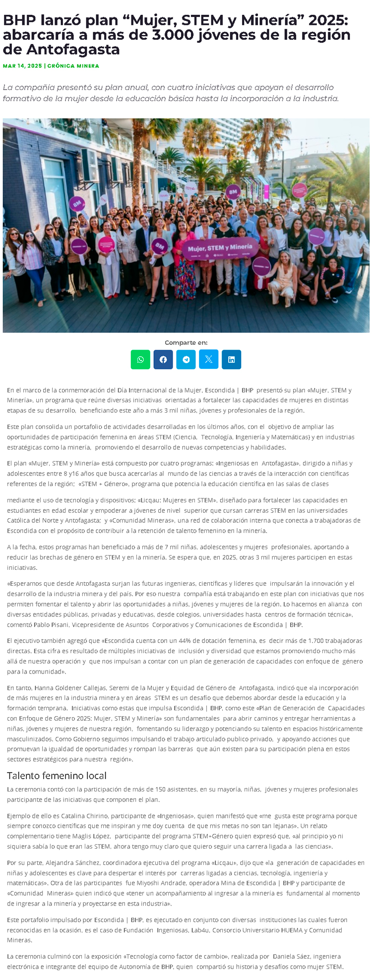 Escondida lanza plan “Mujer, STEM y Minería” 2025 - (minerialocal.cl)