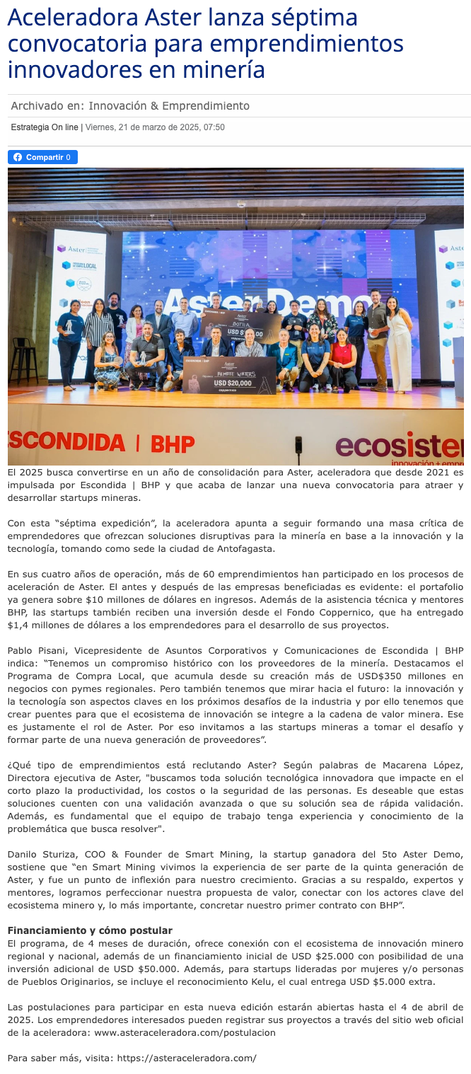 Aceleradora Aster lanza séptima convocatoria para emprendimientos innovadores en minería - (portalinnova.cl)