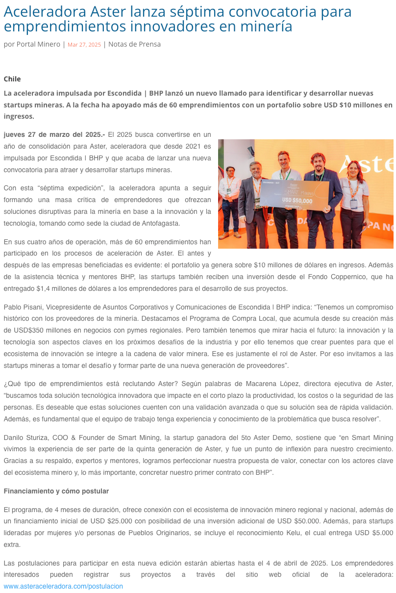 Aceleradora Aster lanza séptima convocatoria para emprendimientos innovadores en minería - (tierramarillano.cl)