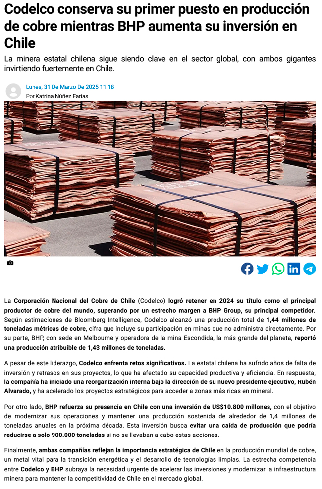 Codelco recupera liderazgo como mayor productor mundial de cobre - (mineriayfuturo.cl)