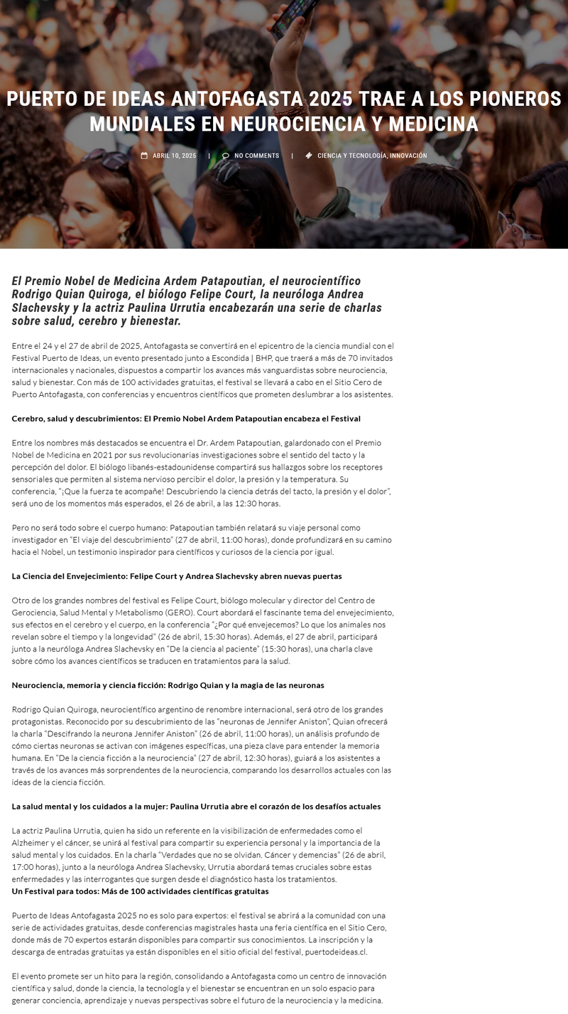 La investigación de vanguardia en neurociencias y medicina se toman el Festival de Ciencia Puerto de Ideas Antofagasta 2025 - (cpcomunicaciones.cl)