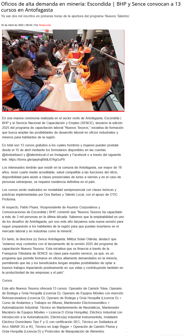 Escondida | BHP y SENCE lanzan nueva convocatoria para capacitaciones en oficios de alta demanda en la minería - (antofapop.cl)
