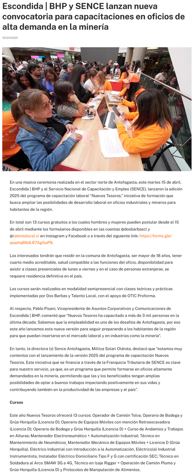 Escondida | BHP y SENCE lanzan nueva convocatoria para capacitaciones en oficios de alta demanda en la minería - (antofapop.cl)