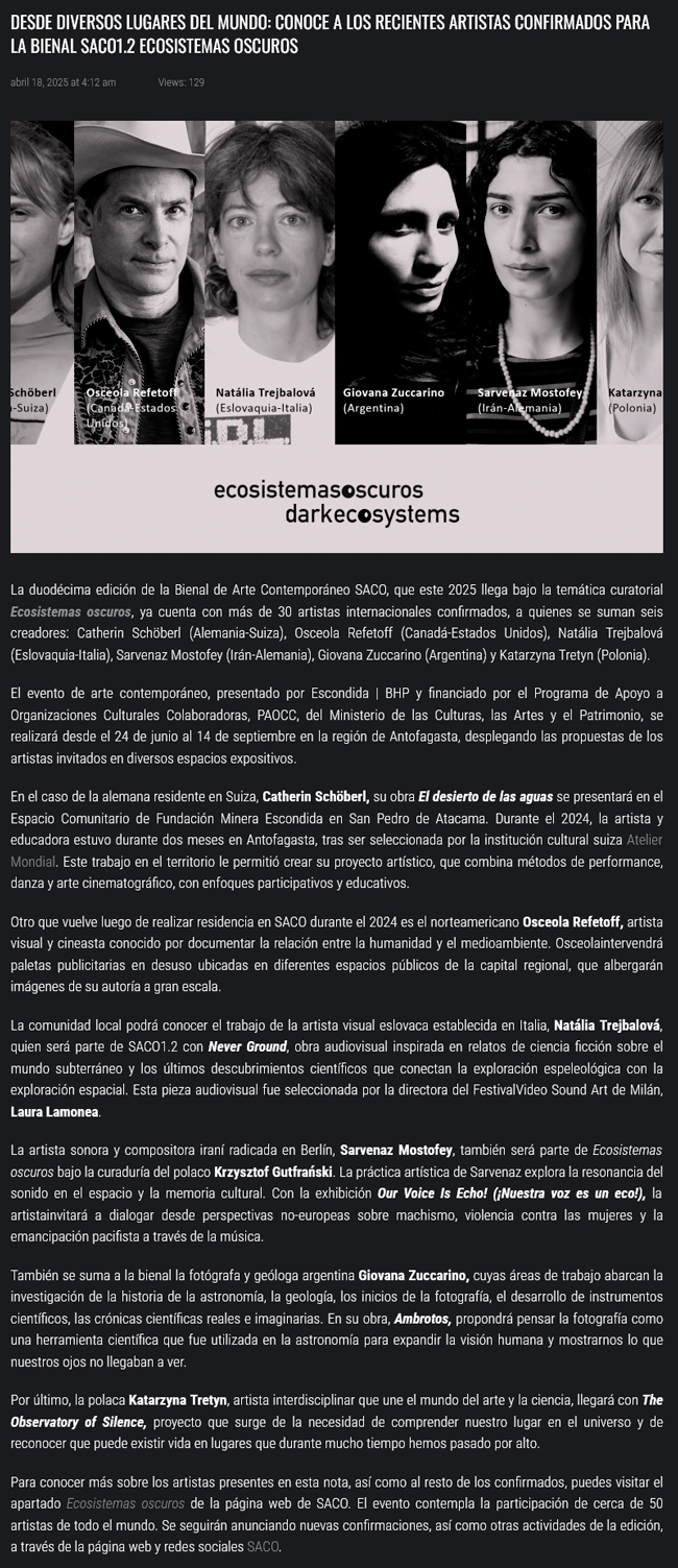 Desde diversos lugares del mundo: Conoce a los recientes artistas confirmados para la Bienal SACO1.2 Ecosistemas oscuros - (antofagastanoticias)