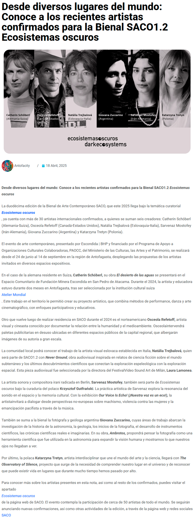 Desde diversos lugares del mundo: Conoce a los recientes artistas confirmados para la Bienal SACO1.2 Ecosistemas oscuros - (antofagastanoticias)