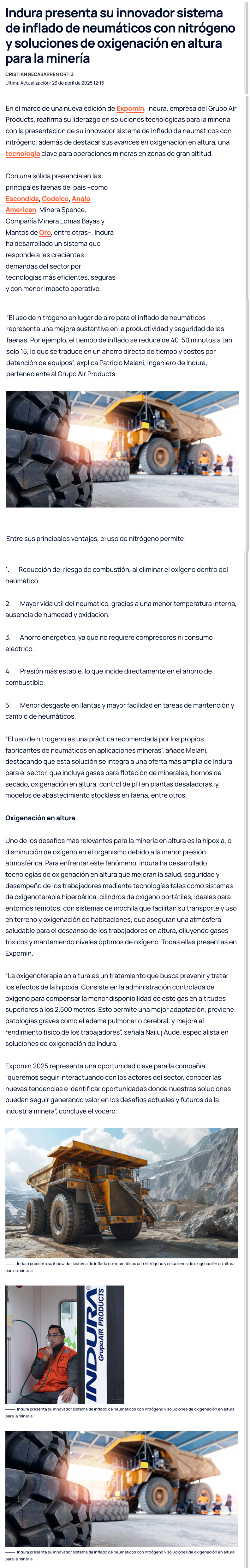 Indura presenta su innovador sistema de inflado de neumáticos con nitrógeno y soluciones de oxigenación en altura para la minería - (portalinnova.cl)