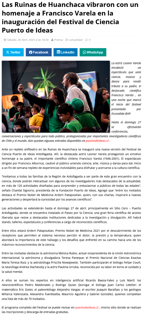 Las Ruinas de Huanchaca vibraron con un homenaje a Francisco Varela en la inauguración del Festival de Ciencia Puerto de Ideas - (antofagastanoticias)