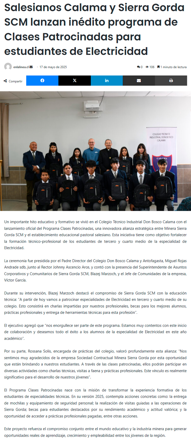 Don Bosco y Sierra Gorda lanzan inédito programa - (La Estrella)