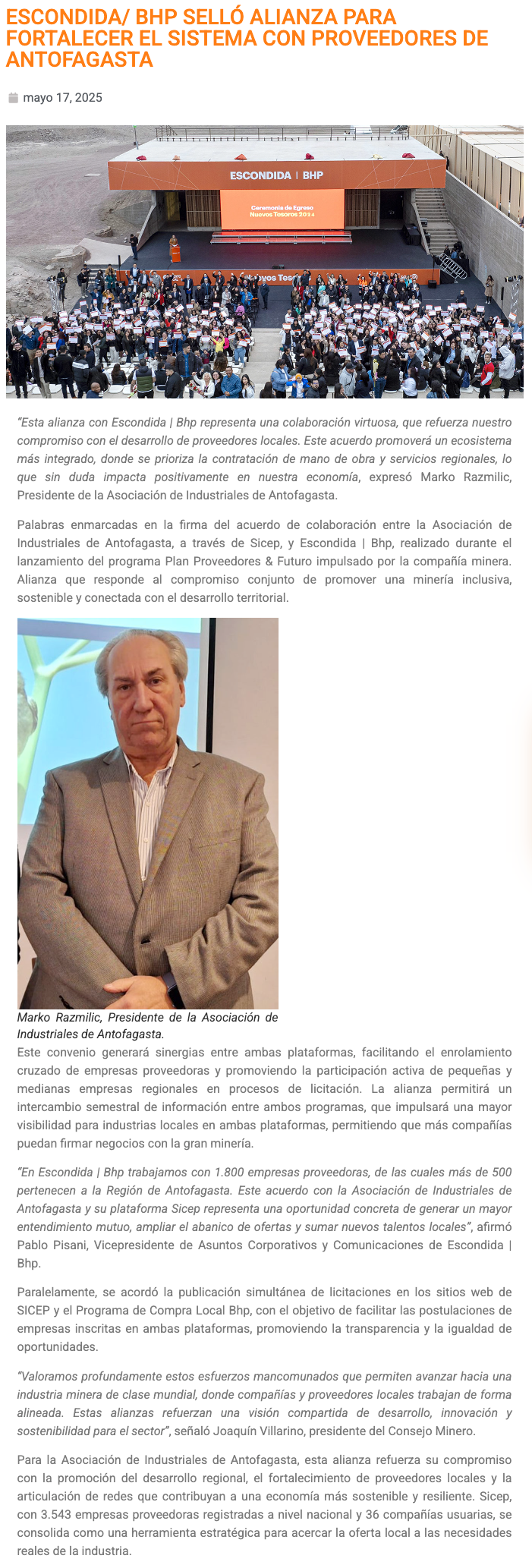 Escondida | BHP lanza programa para aumentar participación de proveedores locales en negocios - (El Mercurio de Calama)