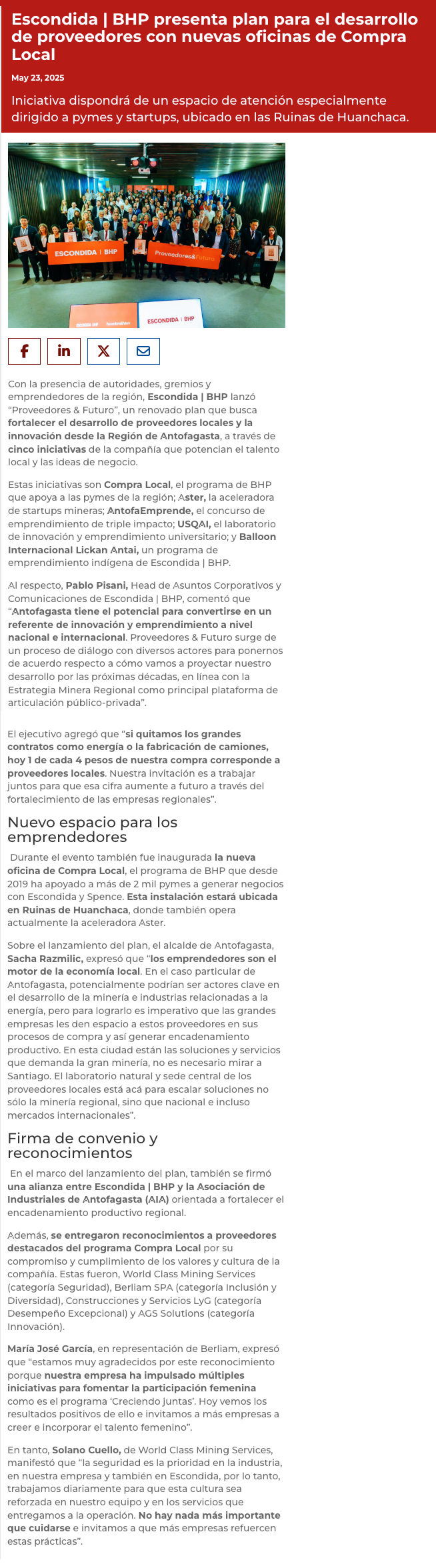 Escondida | BHP presenta plan para el desarrollo de proveedores con nuevas oficinas de Compra Local - (Diario Financiero)