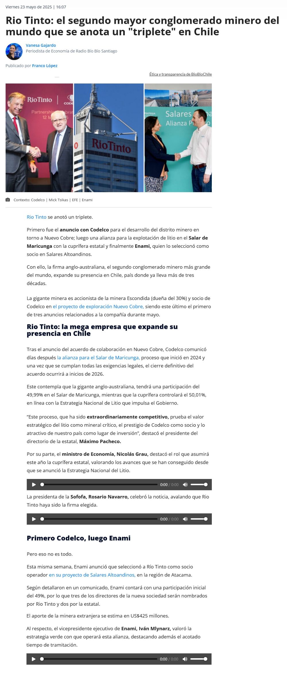 Río Tinto ya suma tres acuerdos para la explotación de litio en Chile - (Radio Biobío)