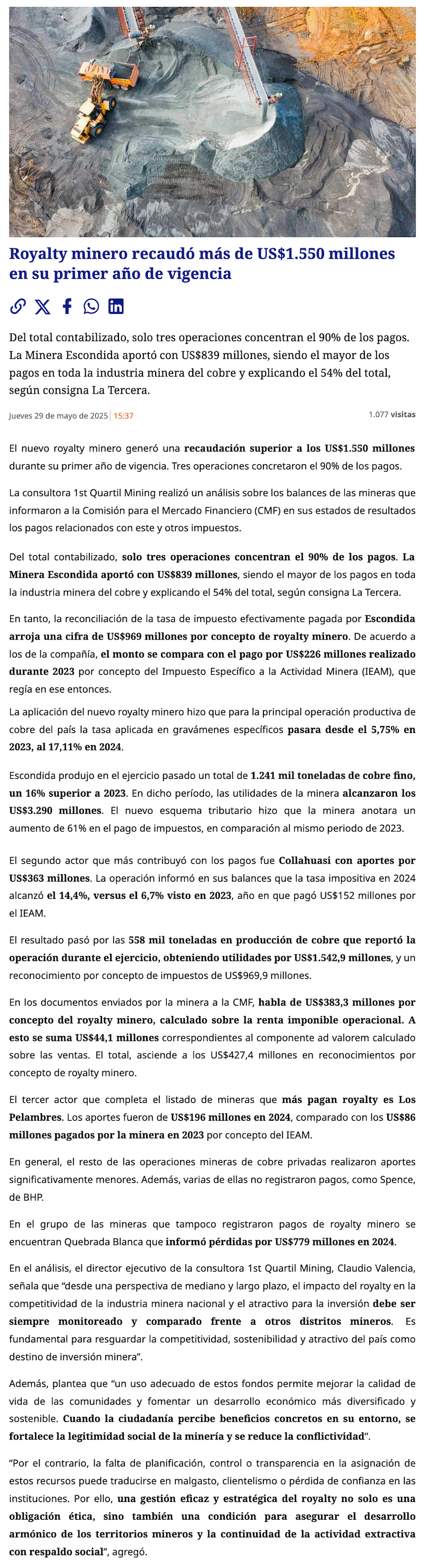 Royalty minero recaudó US$1.550 millones en su primer año de vigencia - (nuevopoder.cl)