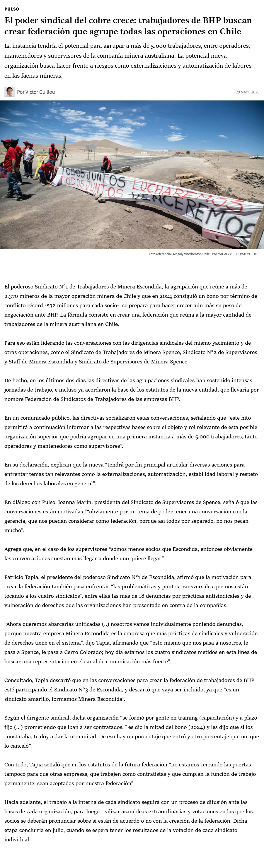 Crece poder sindical del cobre: en BHP buscan crear federación que agrupe operaciones en Chile - (Pulso)
