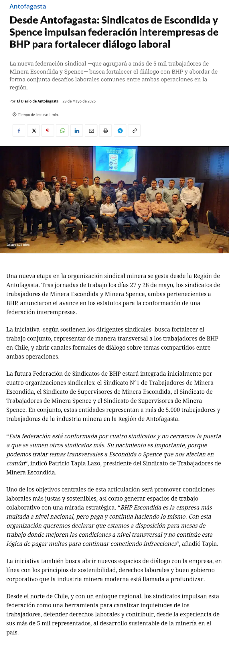 Más de 5 mil trabajadores agruparía nueva federación de Sindicatos de Escondida y Spence - (norteonline.cl)