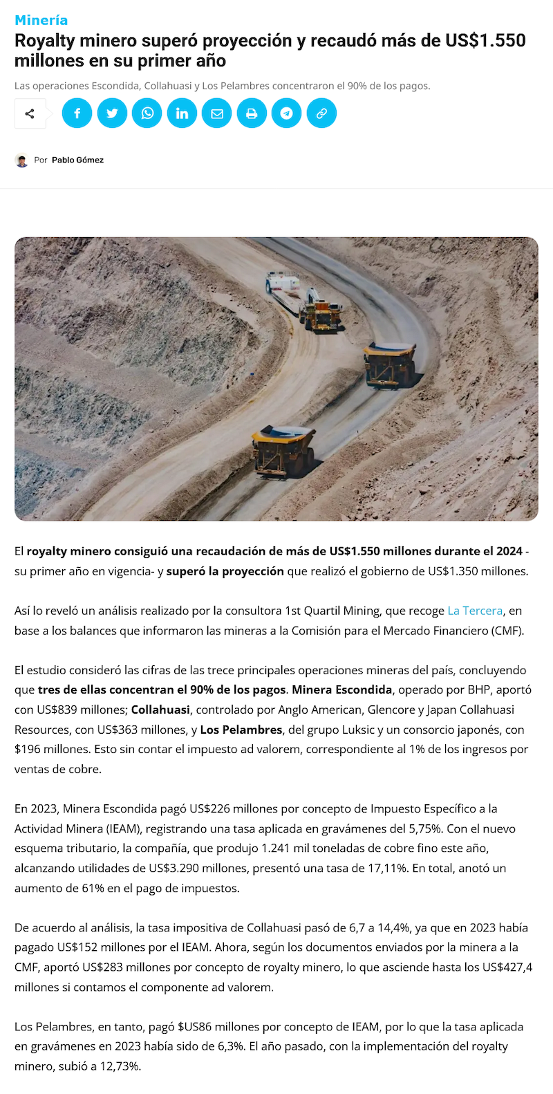 Royalty minero recaudó más de US$1.550 millones en su primer año de vigencia - (puranoticia.cl)
