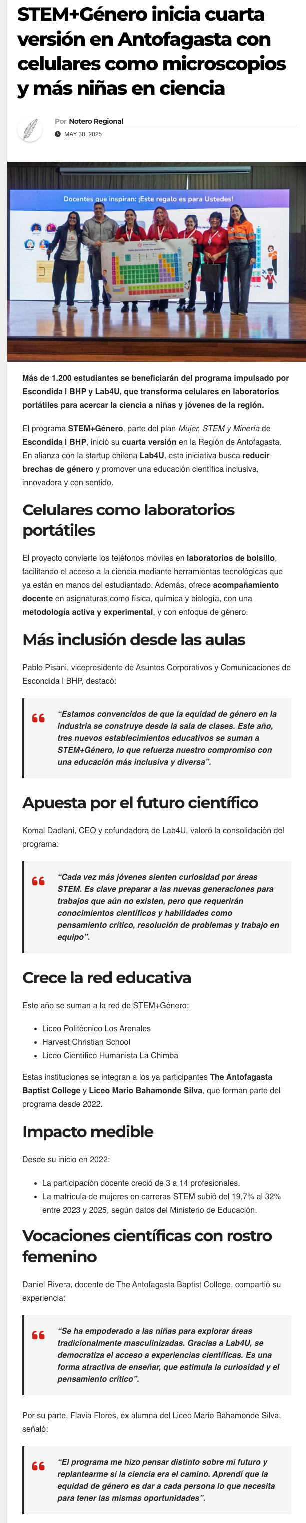 STEM+Género inicia 4° versión con celulares como microscopios y más niñas en ciencia - (norteonline.cl)